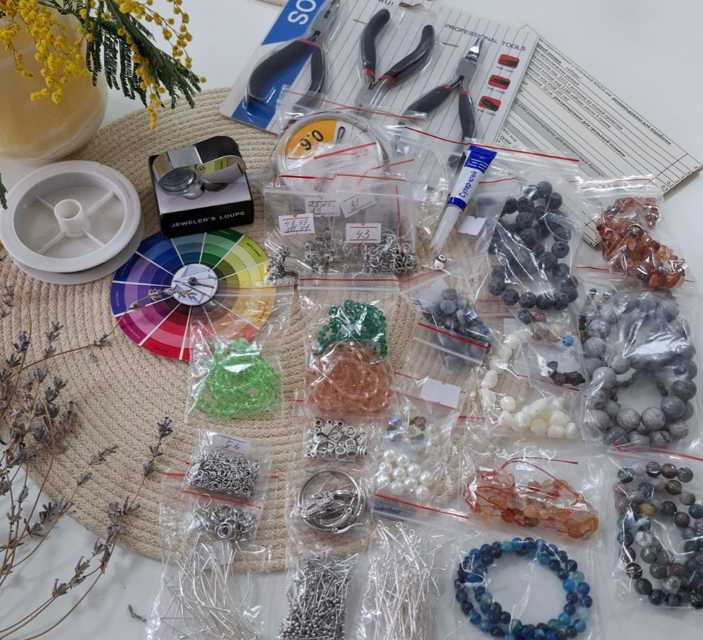 Стоимость набора 8500 р. (доставка бесплатная), купить набор (кликабельно). Не продаётся отдельно, только при приобретении одного из пакетов курса "Супер МАСТЕР украшений". Бусины в наборе представлены разные, без выбора. Этого набора вполне достаточно, чтобы попробовать хотя бы по одному разу каждую технику на практике. Для реализации специфических творческих идей вы также можете использовать дополнительные материалы - свои бусины и фурнитуру, не ограничиваясь набором. Всё-таки учебным набор - это ограниченное количество материалов, а фантазии, как правило, нет предела. Чем больше у мастера материалов, тем интереснее украшения он может создать. Каждый набор уникален и неповторим, состав каждого отличается друг от друга по виду камней.