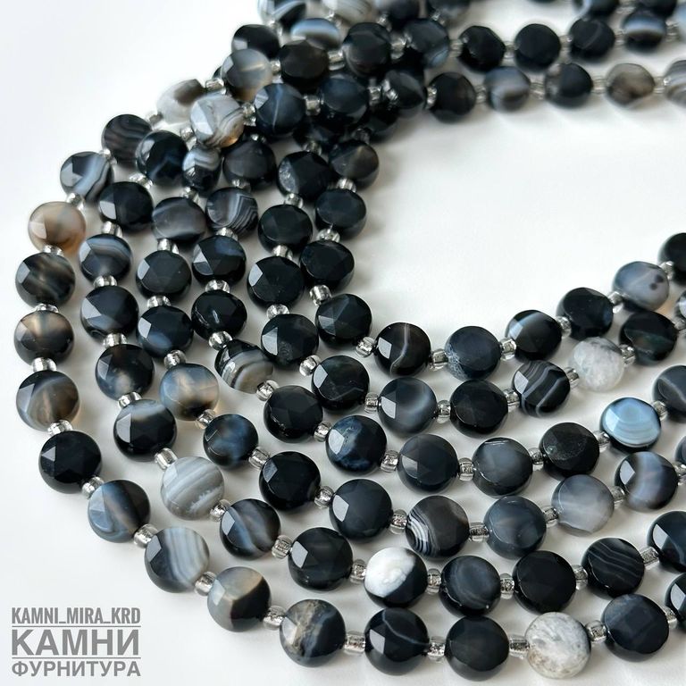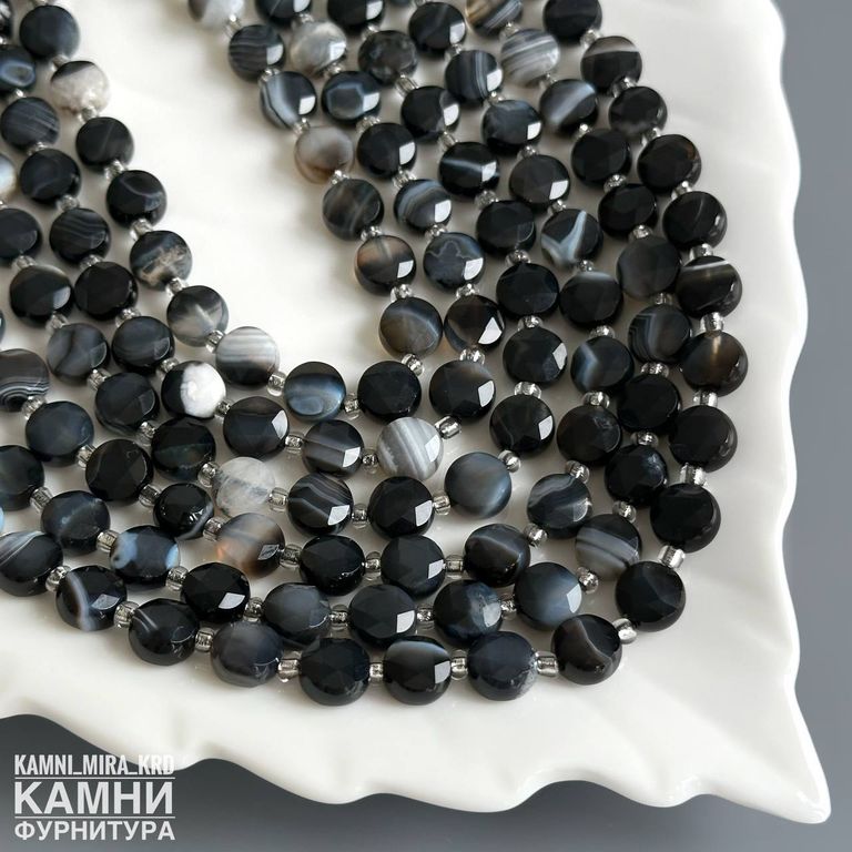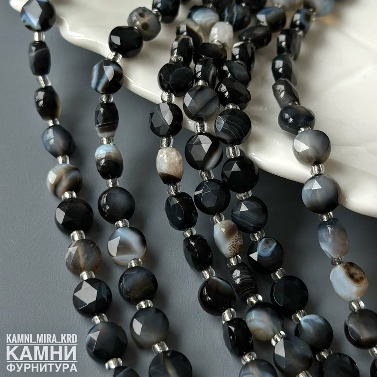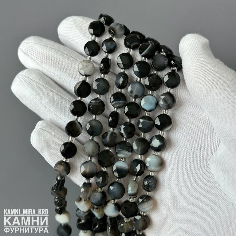Агат чёрный монетки огранка призма-звезда 7,8-8,2 мм сборка через бисер (код 410)