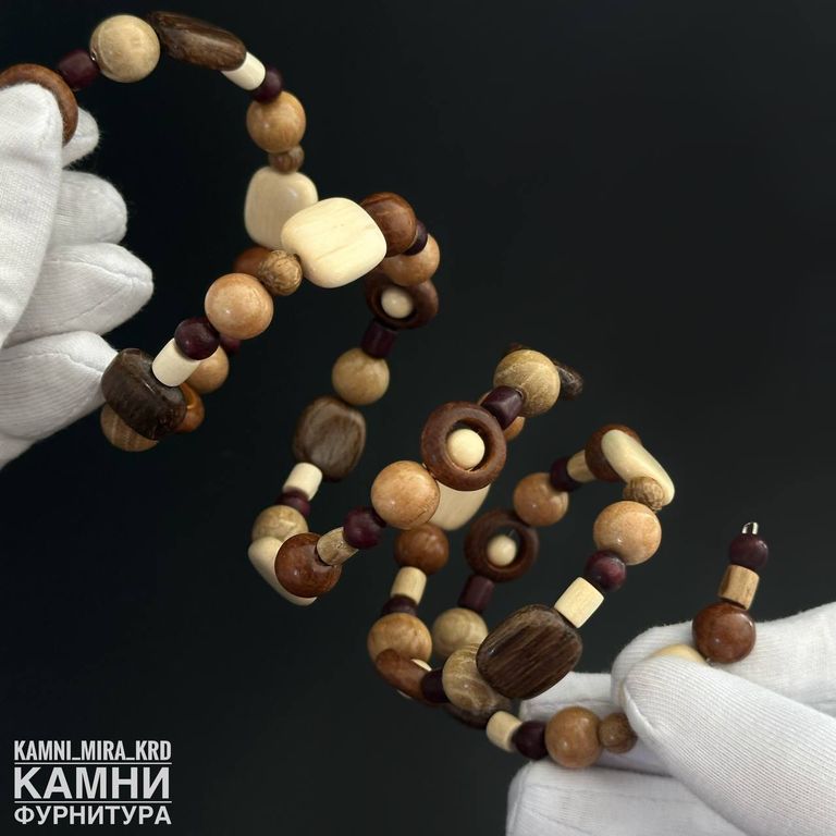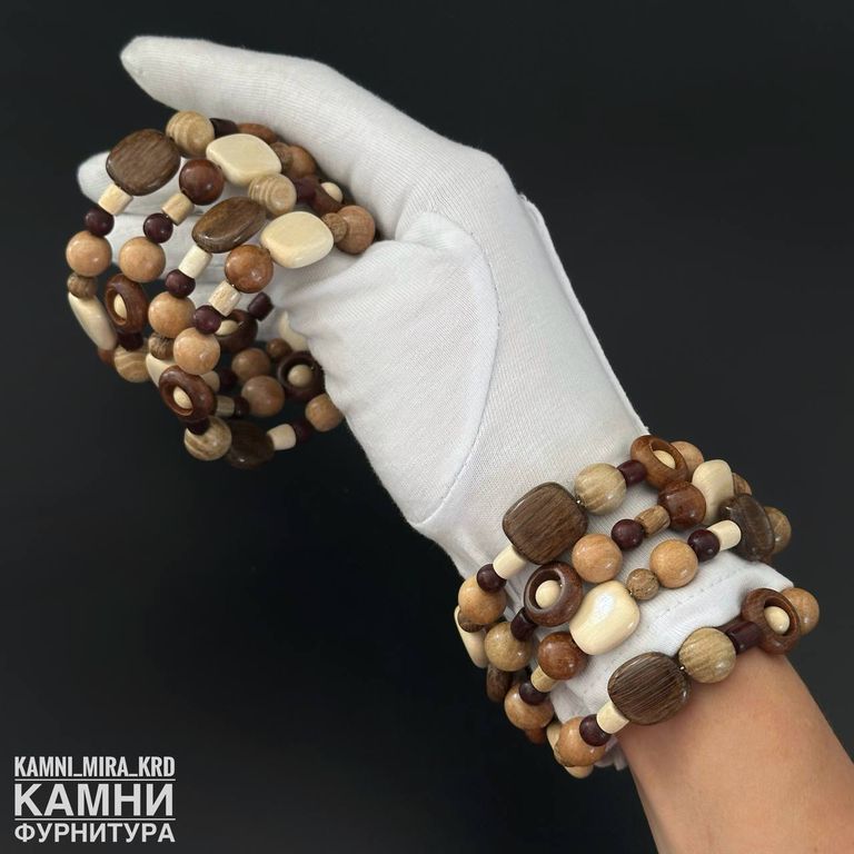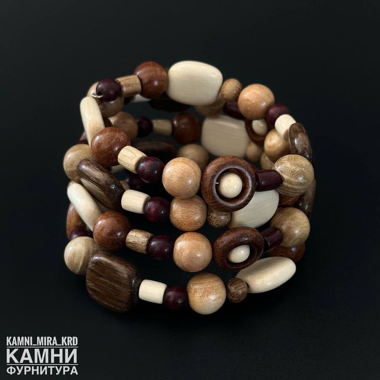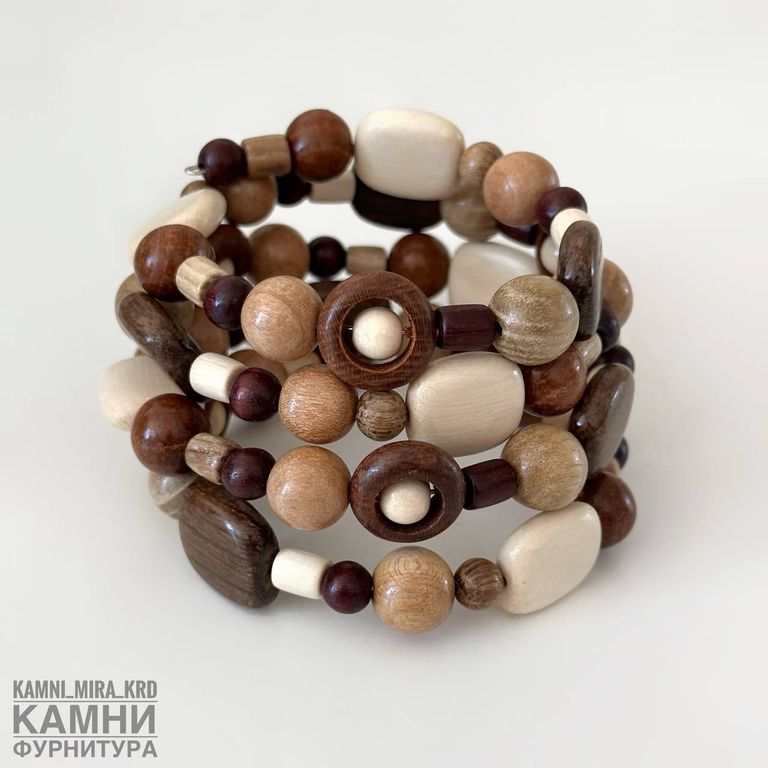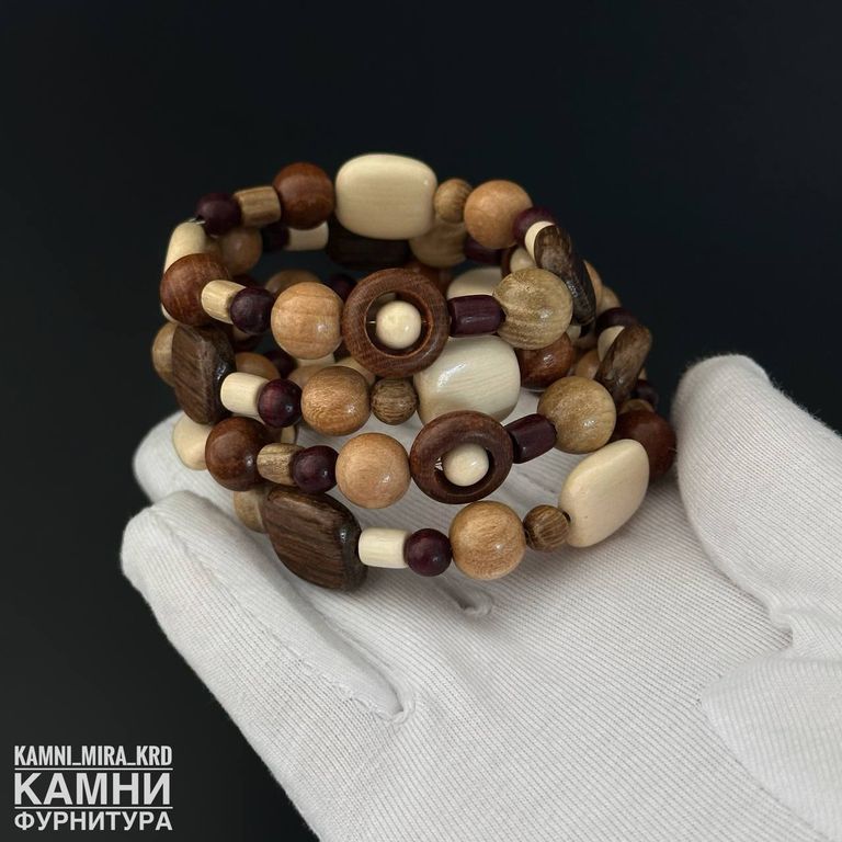 Браслет "Четыре витка яркие оттенки с круглыми бусинами рамками и квадратами" микс деревянных бусин разных форм, цветов и размеров на мэмори-проволке (код 4011)
