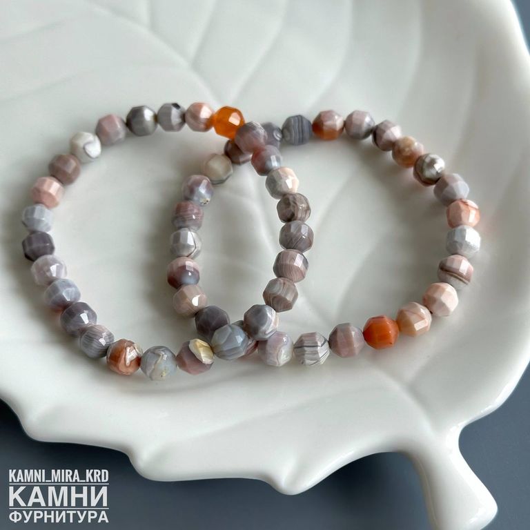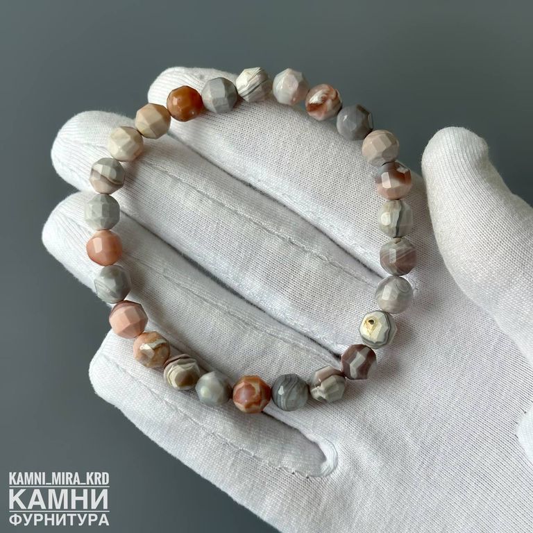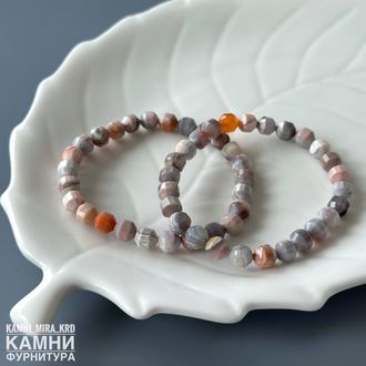Браслет "Розовый агат Ботсвана" агат бежево-розовый с серыми и оранжевыми оттенками, форма бусин фонарик 6,8-7,2 мм около 26 шт (код 4142)