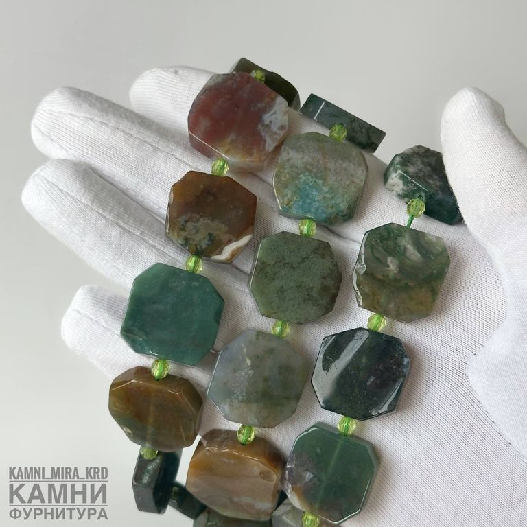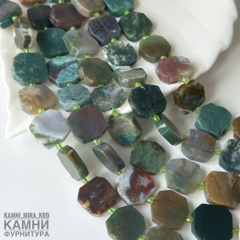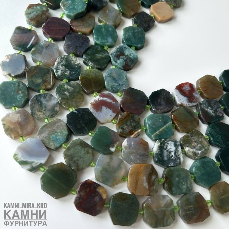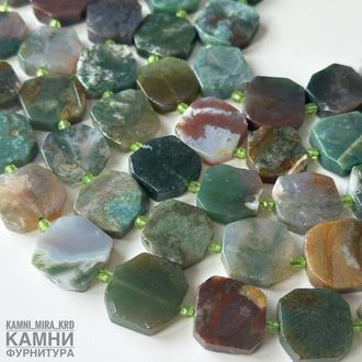 "Индийский агат" халцедон с яшмой, кварцем и хлоритом крупные плоские фигурные бусины 18-20 мм (код 1387)