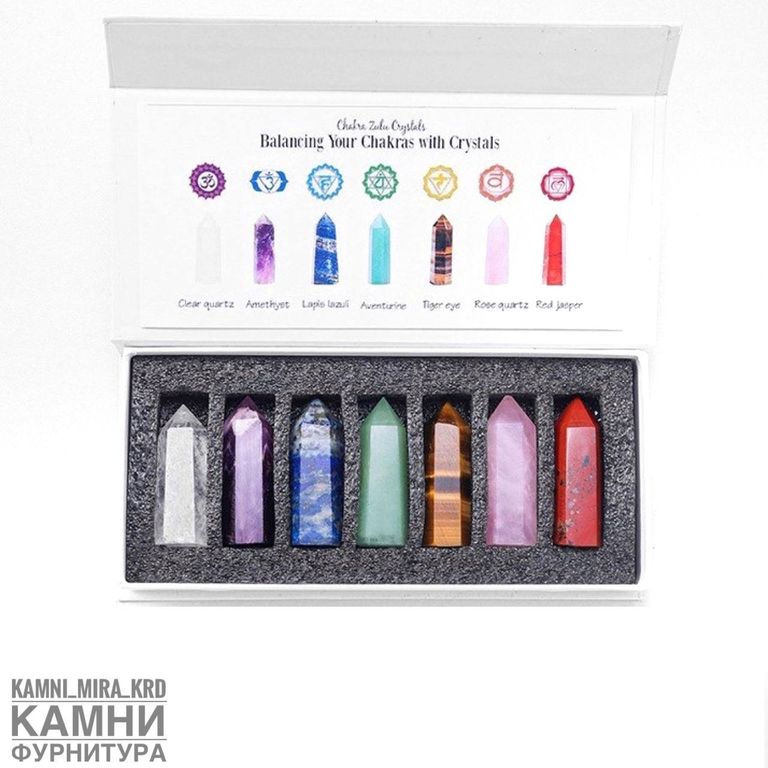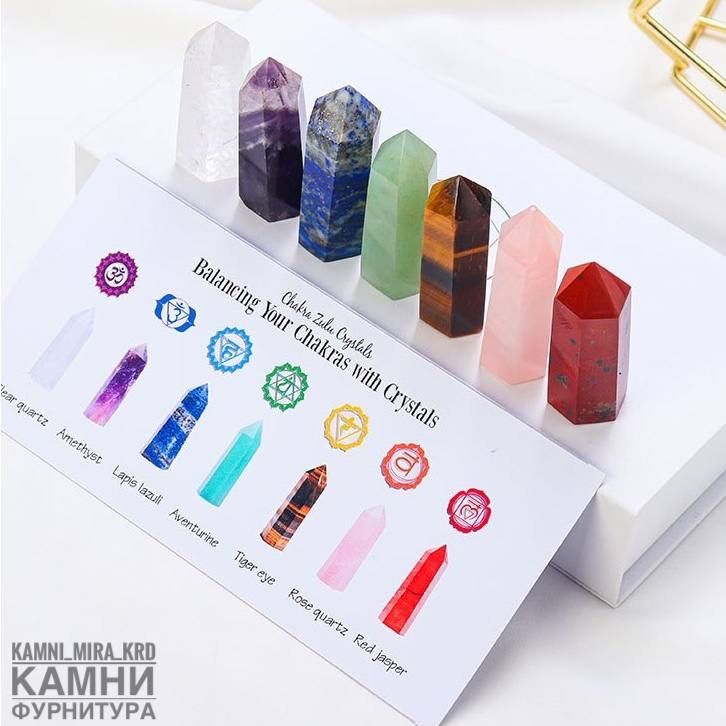 Чакральный набор 7 кристаллов 4-4,5 см в подарочной коробке с описанием (код 1338)